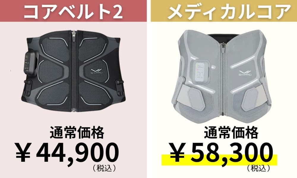 メディカルコアの価格は58,300円(税込)。コアベルト2(44,900円)と比較すると高価です。
